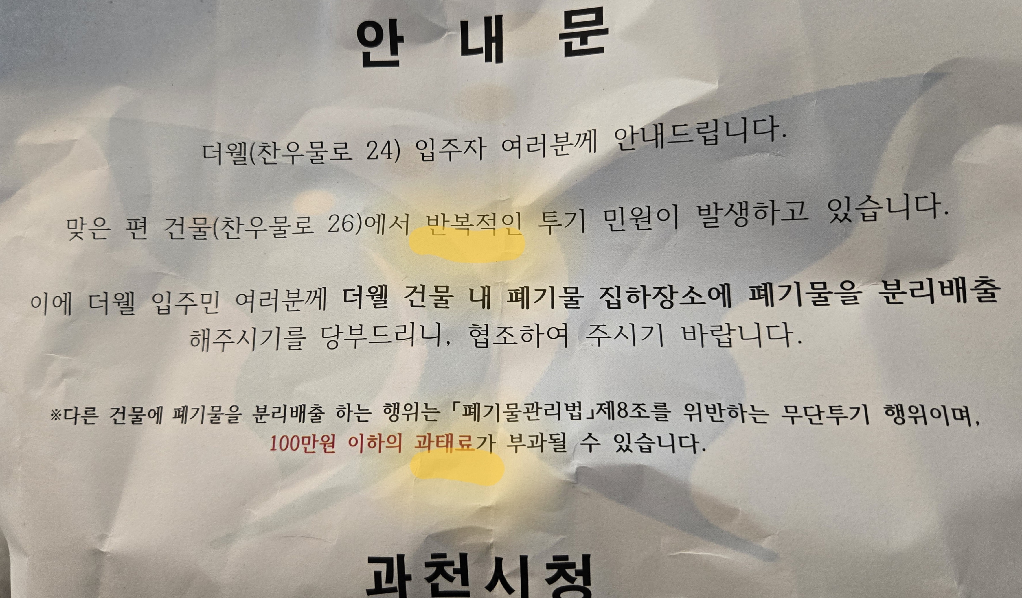 재활용쓰레기 배출(특히, 작은 종이박스)에 조금 더 신경을 써주시기 바랍니다. 과태료가 부과될 수 있으며, 과태료 및 반박/소명/처리 비용을 관리비에 포함하게 되는 최악이 발생하지 않으리라는 법도 없습니다. 적어도, 찬우물로 주민간에 불편함이 더 이상 발생하지 않도록 함께하여 주시기를 당부드립니다.